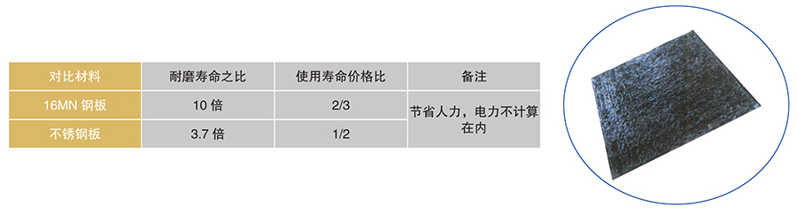 這種耐磨材料及加工方式,是目前國(guó)際國(guó)內(nèi)的重工業(yè)耐磨材料。耐磨復(fù)合板的壽命是16Mn鋼板的8-10倍,是不銹鋼板材的3.7倍。耐磨壽命之長(zhǎng),耐沖擊,耐腐蝕,節(jié)省大量的維修時(shí)間和人力,其使用生命與價(jià)格之比非常低廉,是非常經(jīng)濟(jì)的耐磨材料。